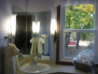 The bathroom was depressing with a low ceiling and visible mold around a rotting window and on bathtub walls. Volunteers completely gutted the bathroom to remove the damaged materials. Spray foam insulation in the bathroom walls will prevent condensation on cold surfaces, and a cement board substrate for the tile shower walls will never become moldy. A new tub from Renew It was installed along with new plumbing fixtures and an acrylic block window. An air-to-air exchanger provides ventilation for the bathroom and the rest of the home to remove excess humidity and provide fresh air. A colorful shower curtain and new light fixtures chosen by AnneMarie Design set off the new, bright look. Tammy just loves her new bathroom.